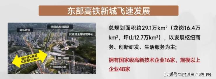 以坪山高铁站为中心发展枢纽商务、创新研发、生活服务。总规划面积约29.1万k㎡,其中龙岗16.4万k㎡,坪山12.7万k㎡。拥有国家级高新技术企业16家,规模以上企业48家。