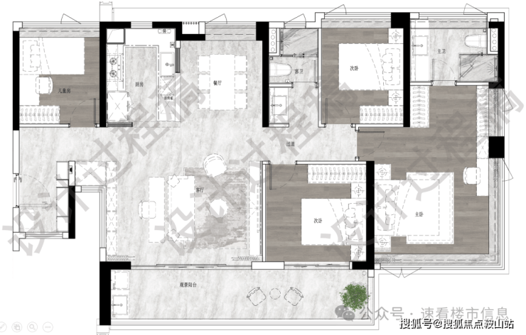 建面123平四房两卫,南北对流户型,LDKB一体化设计,约7米长景观阳台,主卧设置L型衣帽间,三个次卧差不多大小,转角玄关用作收纳。