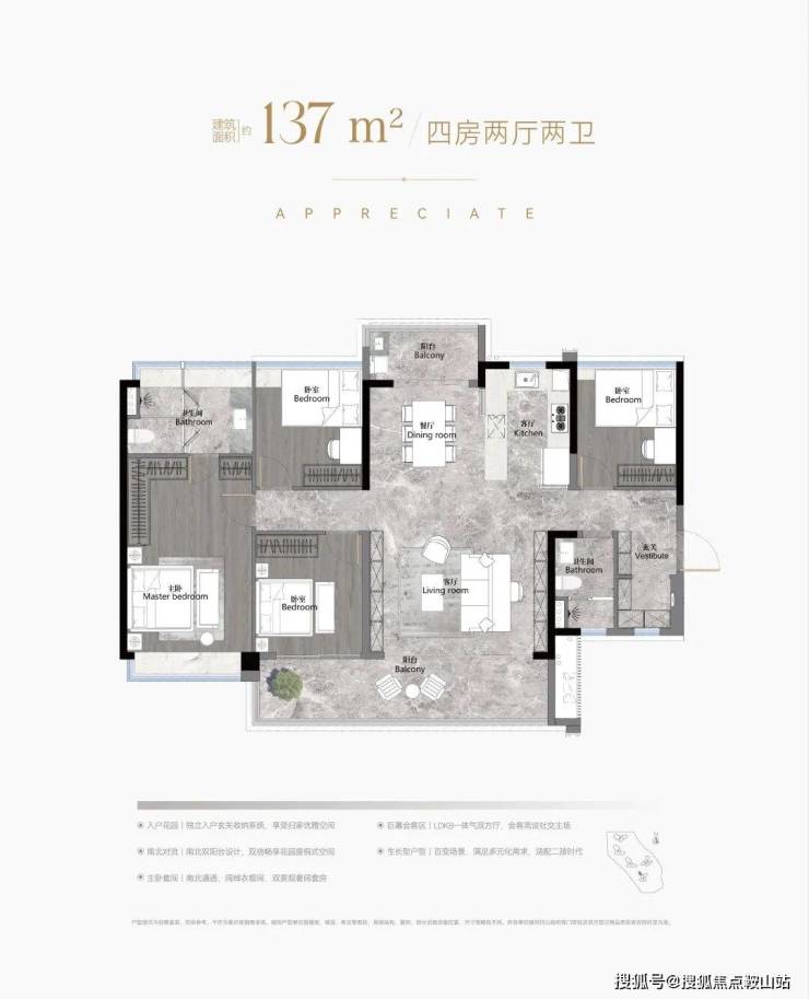 建面168平四房三卫,放大版的142平,做了双主套,适合三代同堂家庭,单边位,南北对流采光通风都非常好,约40平的大房厅,景观阳台开间约8.2米.