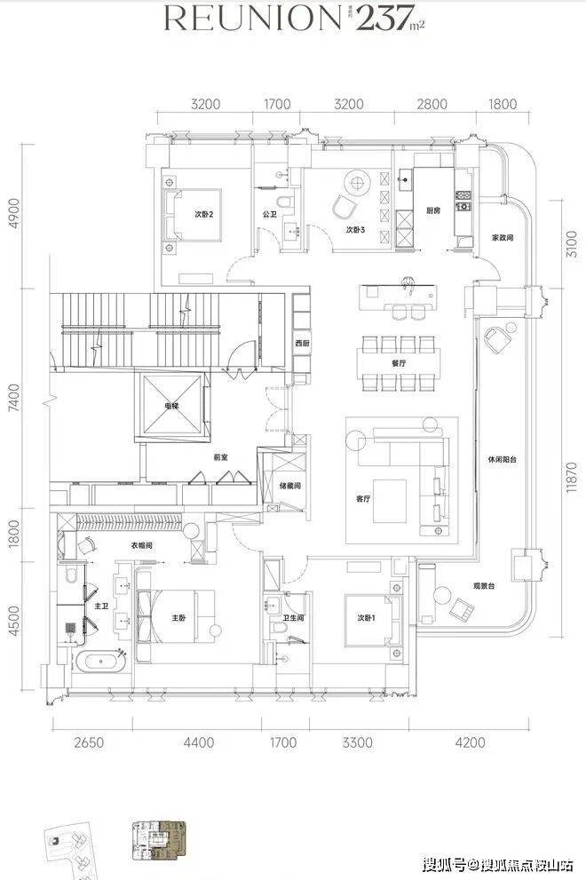 237㎡4+1房3卫户型阳台达11.8米,采用270°全景阳台最大化采光和观景效果,功能分区做得很好。采用一户一梯专梯入户,南北通透结构,是整个南山里非常稀缺的户型