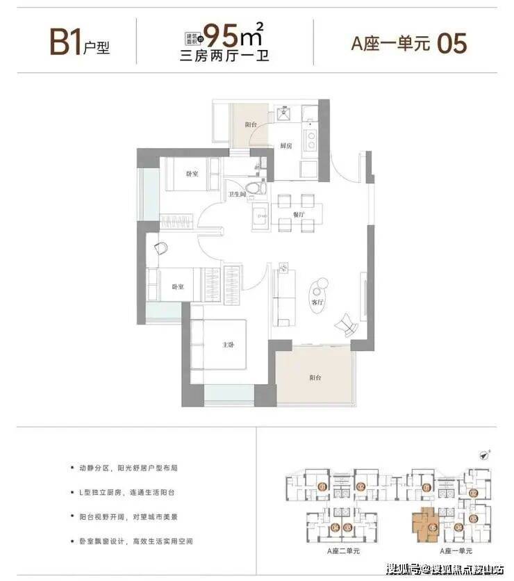 户型面积布局B195平三房两厅一卫设计的是竖厅格局,客厅3.4米开间,LDKB一体化,动静分区,L型厨房,带1个生活阳台,卫生间三段式分离设计,阳台东南朝向。