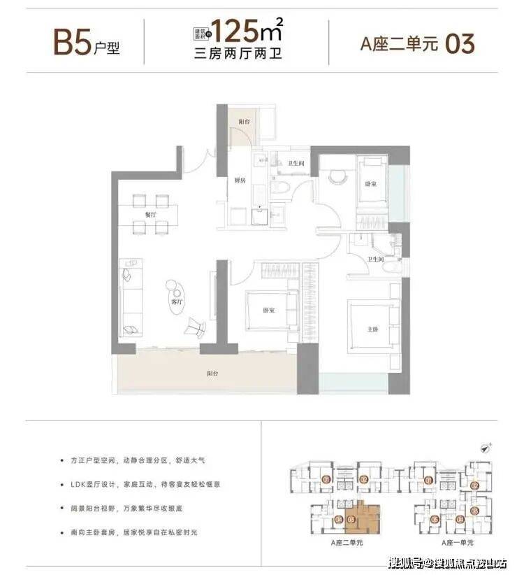 户型面积布局B5125平三房两厅两卫设计的是竖厅格局,客厅4米开间,动静分区,三开间朝南,客厅连接次卧出巨幕大阳台,厨房带1个生活阳台,公卫三段式分离设计,阳台东南朝向。