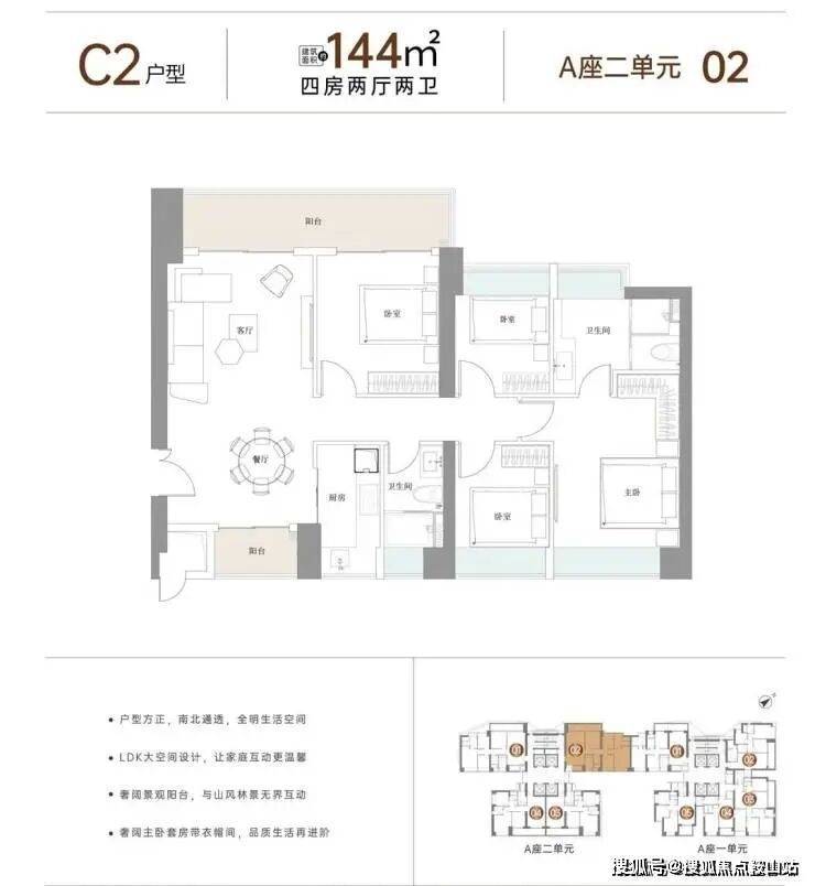 户型面积布局C2144平四房两厅两卫设计的竖厅格局,客厅4米开间,动静分区,南北通透双阳台设计,客厅连接次卧出巨幕大阳台,L型厨房,卫生间干湿分离,大阳台主朝西北向。