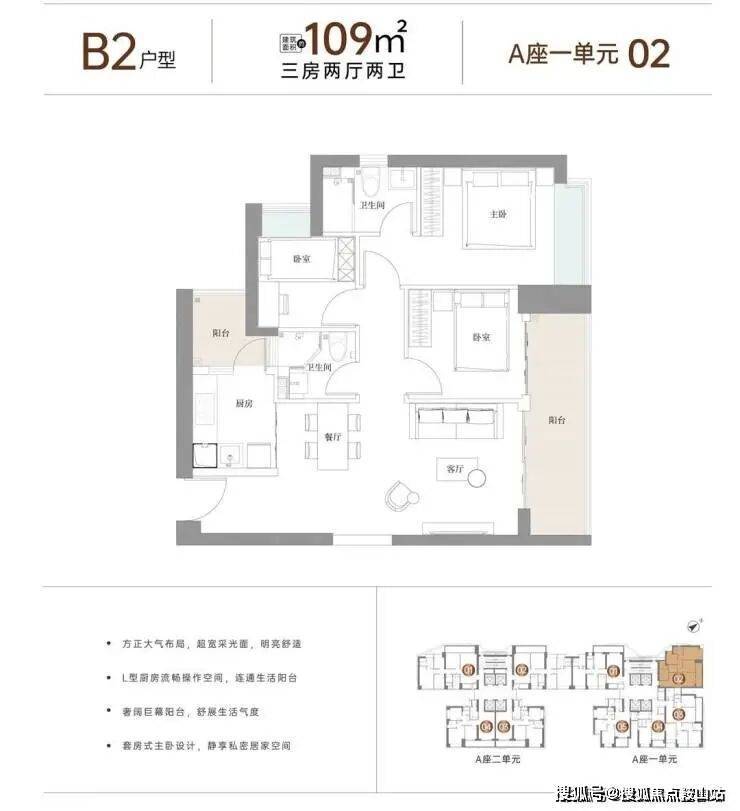 户型面积布局B2109平三房两厅两卫设计的是竖厅格局,客厅3.5米开间,LDKB一体化,动静分区,客厅连接次卧出巨幕大阳台,L型厨房,带1个生活阳台,卫生间干湿分离,阳台东北朝向。