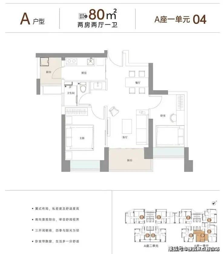 户型面积布局A80平两房两厅一卫设计的是竖厅双龙抱珠格局,客厅3.2米开间,三开间朝南,一字型厨房,还带1个生活阳台,卫生间三段式分离设计,阳台东南朝向。