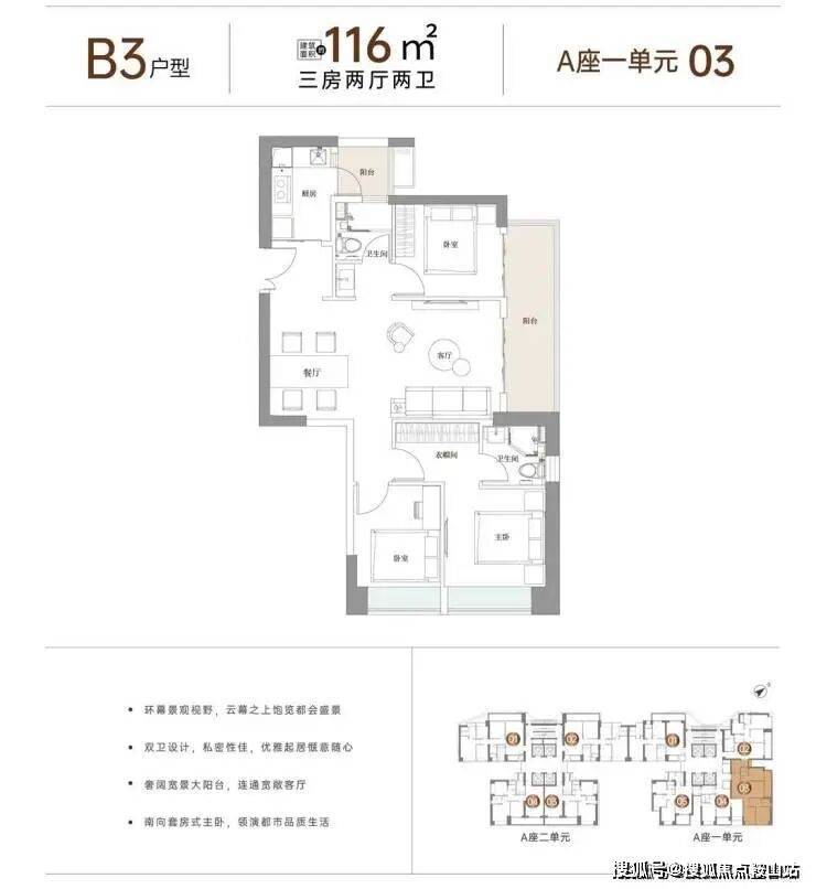 户型面积布局B3116平三房两厅两卫设计的是竖厅格局,客厅3.5米开间,客餐厅一体化,主卧东南向,客厅连接次卧出巨幕大阳台,L型厨房,带1个生活阳台,公卫三段式分离设计,阳台东北朝向。