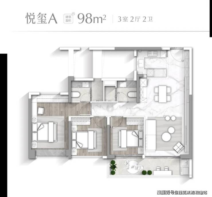 98㎡悦玺 A 户型:四开间朝南,半开放式中西厨房,LDKG布局,带6.4米阳台,适合刚需购房者。