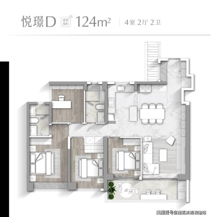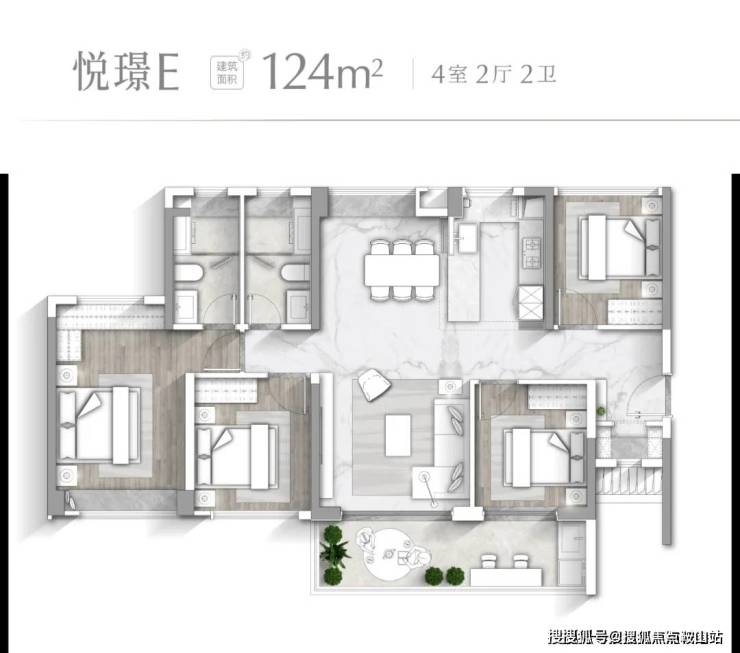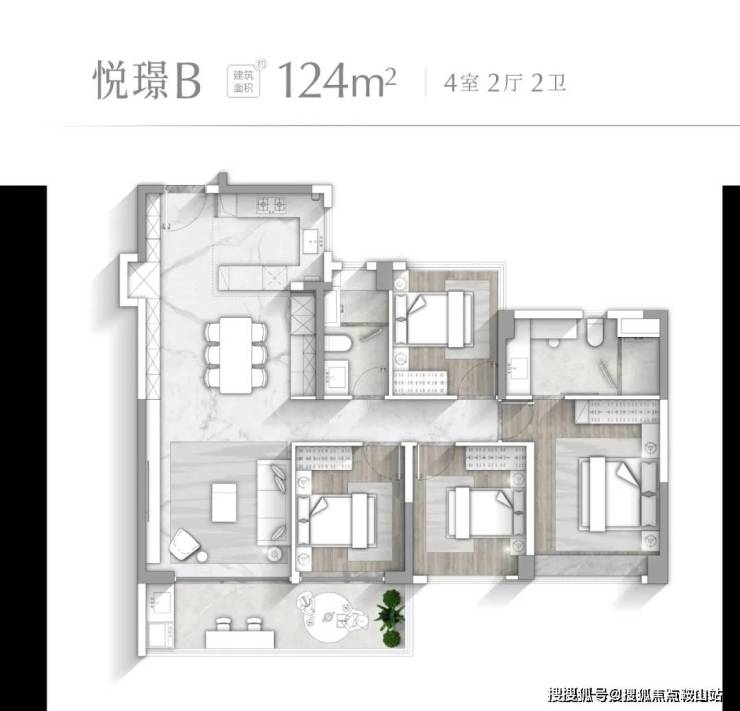 124㎡悦璟系列(B、D、E户型):三南向卧室,厅卧空间灵活改造,6.5 - 6.7米双面宽阳台,改善型家庭的理想选择。