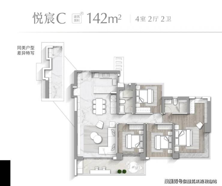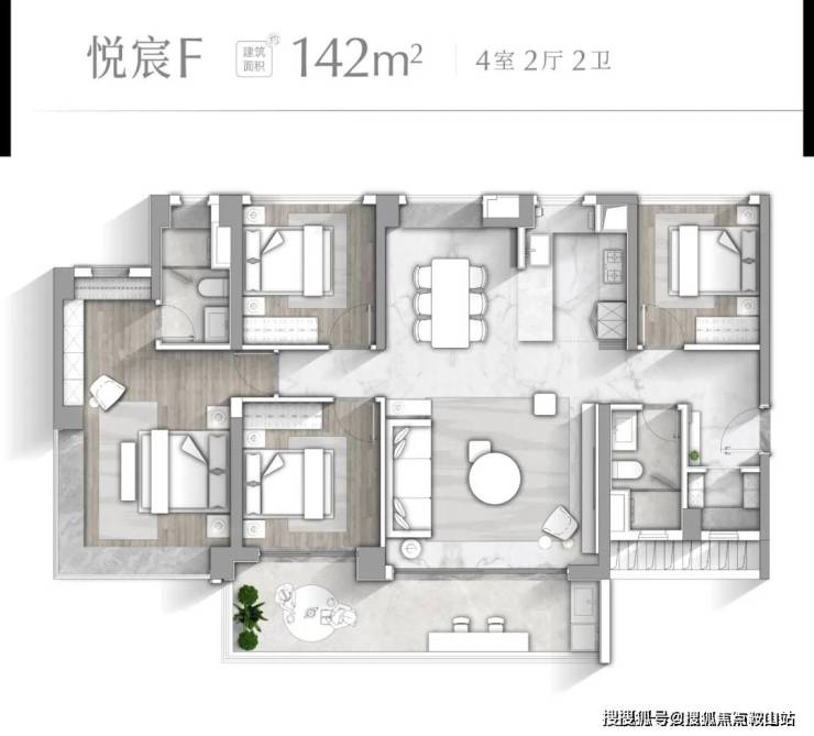 142㎡悦宸系列(C、F户型):客厅开间4.6 - 4.85米,7.7 - 8.4米双面宽阔景阳台,舒适度极高。