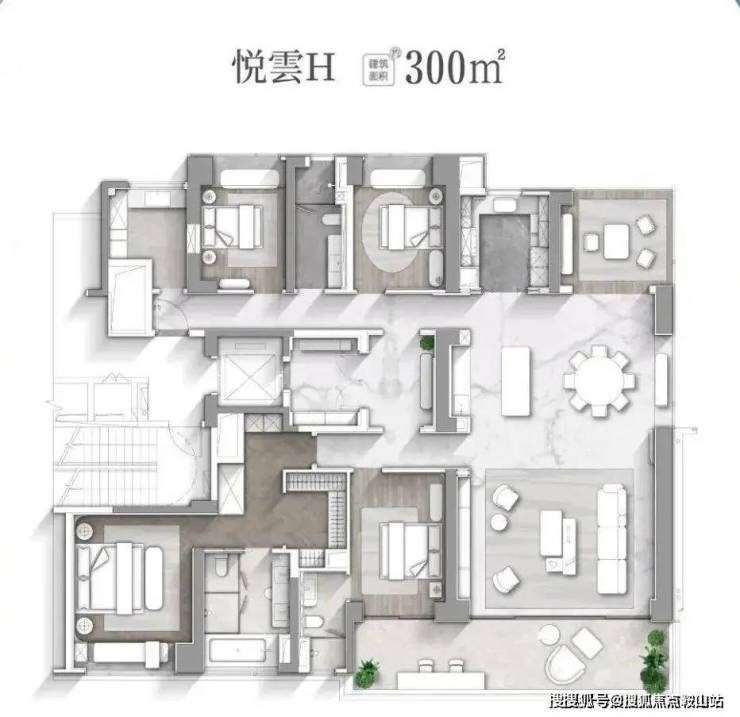 300㎡悦雲 H 户型:IMAX观景阳台,一梯一户设计,豪华主卧套房,为追求极致生活品质的人群量身定制。