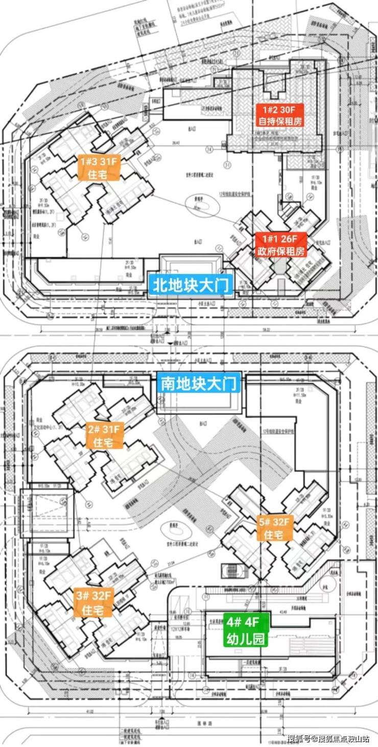 2、3、5栋为纯住宅,总高31-32层,4栋为1所4层2970㎡幼儿园,容积率4.3。