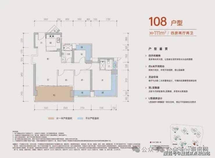 竖厅设计动静分区,约3.5米开间主卧,带独立卫生间,书房L型飘窗,多面采光更通透,U型厨房布局,流线顺畅。