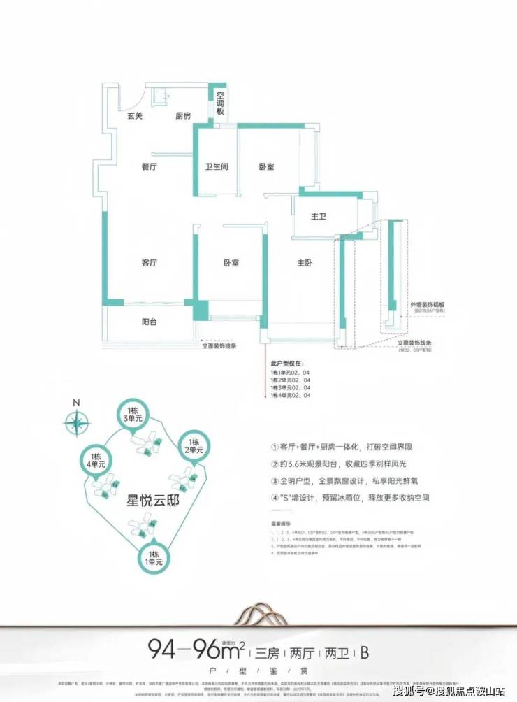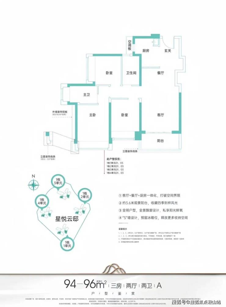 94㎡的3房2厅2卫,设计的经典竖厅格局,客厅3.6米开间,客餐厨一体化,S墙设计预留冰箱卡槽位,三开间朝南,3个卧室分别做到了主卧14.41㎡/次卧9.72㎡/次卧8.23㎡(包含墙体飘窗),U型厨房,得房率:78.15%(不含赠送),西南或东南朝向。