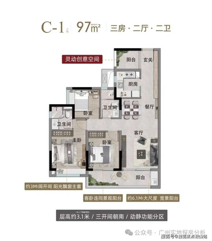 97㎡3+1房2卫,三开间朝东南,约6.1米大阳台,梅花岭一线山景,约96%高实用率,3.1米层高。