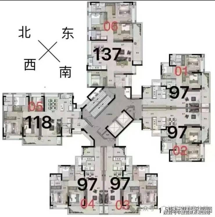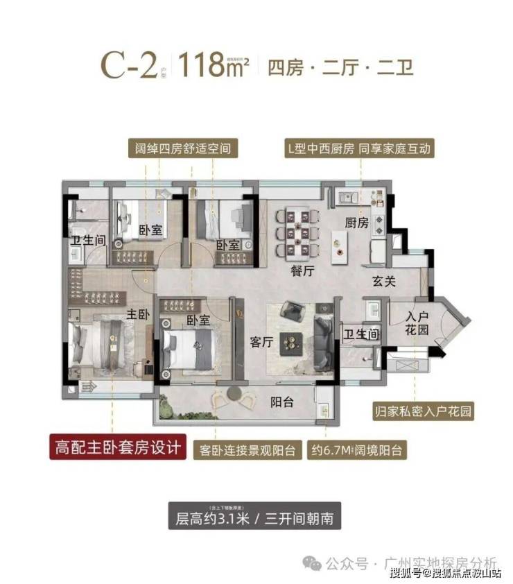 118㎡南北对流四房,四开间南北对流,约6.7米大阳台,山园双景双面景观,98%户型使用率,3.1米豪宅层高。