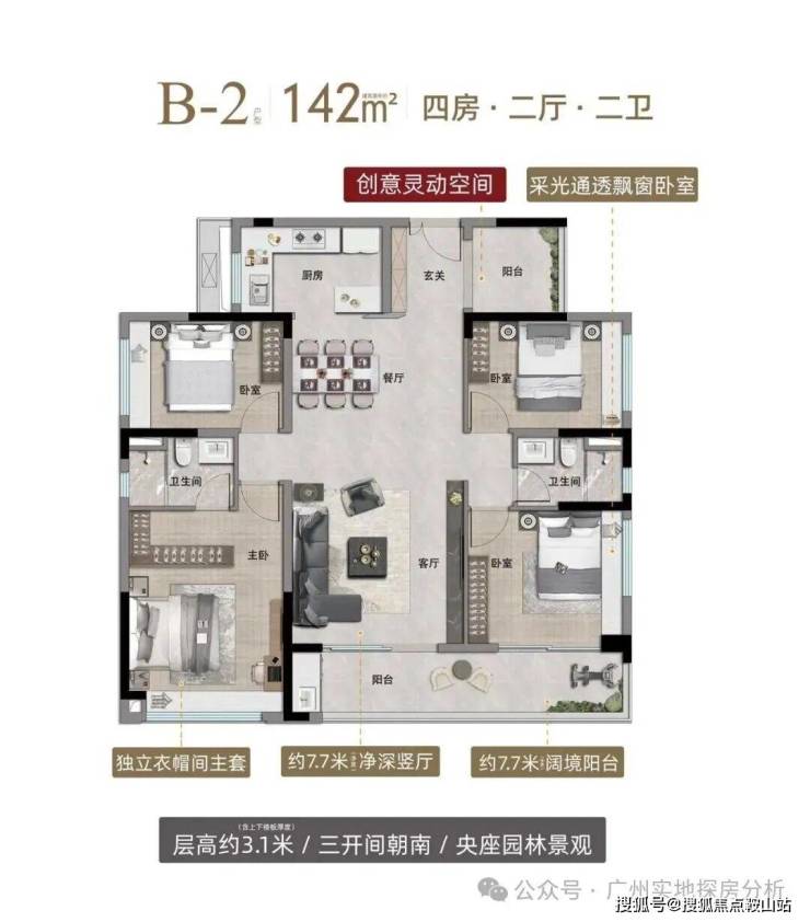 142㎡4+1房2卫,四开间南北对流,约7.2米大阳台,约5.8米超阔绰客厅开间(板块唯一)东南向梅花岭一线山景,3.1米豪宅层高。户型使用率89%。
