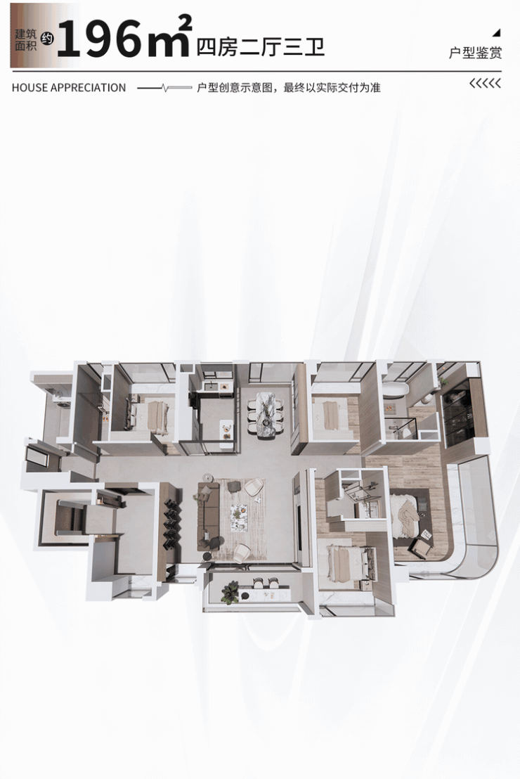 如建面约196㎡四房,南北对流,带双阳台、双南向套房,讲究的就是极致舒适。