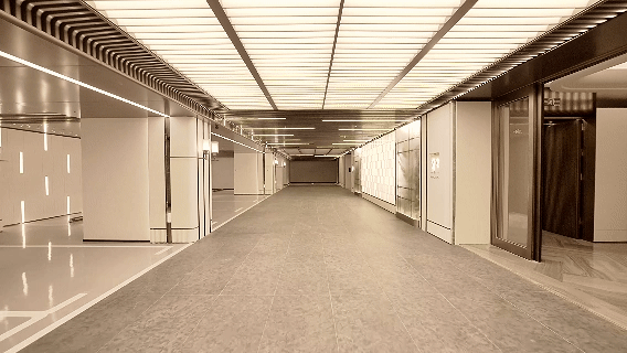 车库入口,灯光透过星空吊顶,点点星光在不同材质上形成漫反射,致敬劳斯莱斯的星空顶。