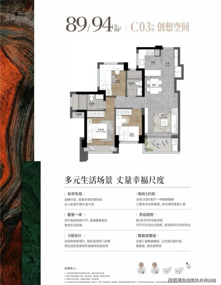 89-94平:3房2厅2卫,套内净使用率在80%,东南朝向
