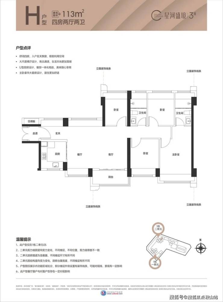 107-113㎡四房两卫:设计为竖厅南北通透格局,进门入户玄关,ldb一体化设计,全屋8面飘窗,四开间朝南,u型厨房,卫生间干湿分离,得房率约76-81%(不含赠送),阳台主朝西北向。