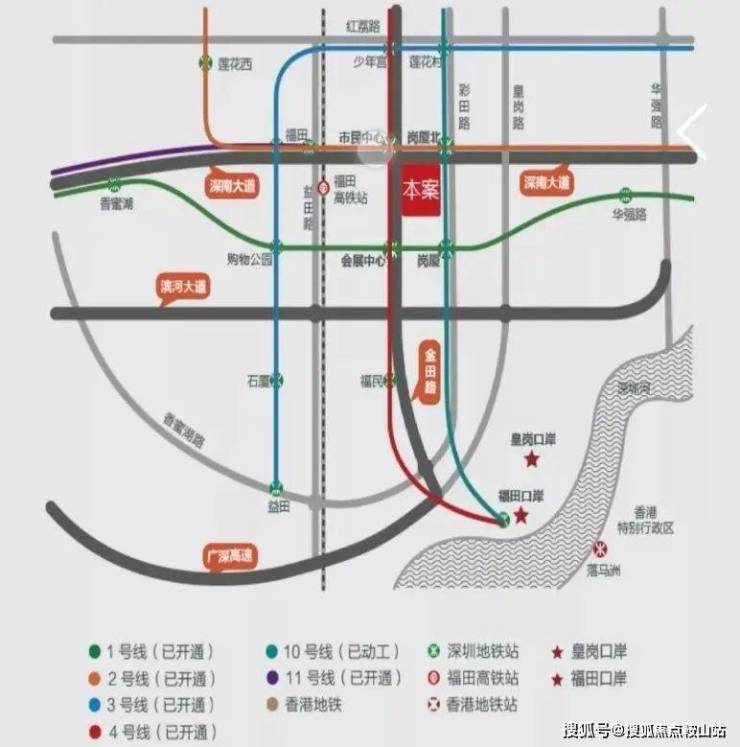 【中心效率】双枢纽双口岸 深港头排畅联世界无缝接驳“五线换乘”岗厦北综合超级枢纽, 2公里内即达全国最大陆路口岸福田口岸及皇岗口岸 由亚洲最大地下高铁站——福田高铁站乘坐高铁,仅需14分钟直达香港西九龙2大综合交通枢纽(福田高铁站、岗厦北交通枢纽)2大超级口岸(福田口岸、皇岗口岸)2条城市东西干道(深南大道和滨河大道)+8条地铁线项目周边汇聚了8条地铁线路,4个站点,其中离1&9号线岗厦站约200米,离4&8号线市民中心站约484米。8条地铁线,1号线罗湖-机场、2号线莲塘-赤湾、3号线福保-双龙、4号线福田口岸-牛湖、7号线西丽湖-太安、10号线福田口岸-双拥街、11号线福田-碧头、14号线(施工中,岗厦北-沙田) ;