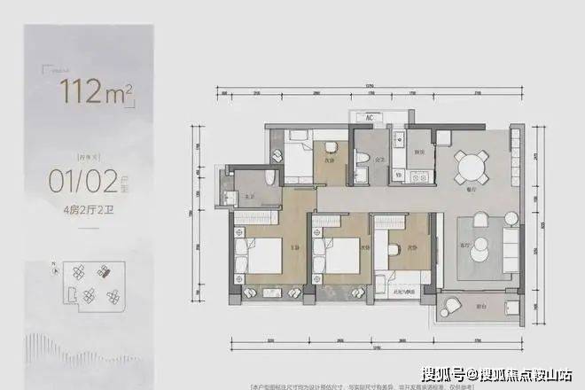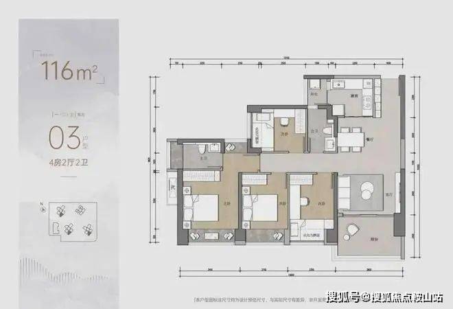 116平在97平原先结构基础上又多加了一个房间,而且客厅开间也是做到了 3.8m 更为阔绰。