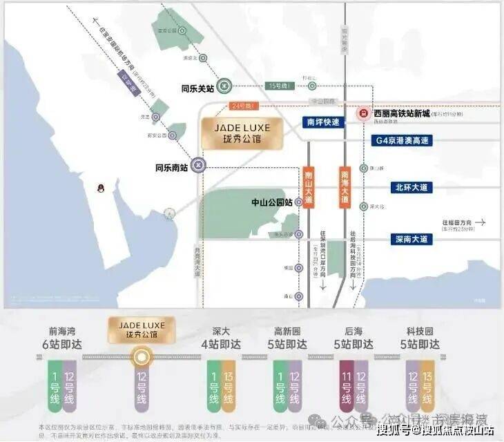 项目拥有“3地铁+3枢纽+2纵4横路网”的多维立体交通体系,通勤效率与出行便捷度兼具。已运营的地铁12号线同乐南站距离项目仅约500米,步行6-8分钟即可抵达,乘坐该线路4站约12分钟可达科技园核心区,5站约15分钟覆盖高新园,无缝衔接南山科创核心板块。在建的地铁15号线同乐关站距离项目约1.2公里,预计2028年12月开通,作为深圳“一环线”,未来将串联宝中、前海、深圳湾、西丽等核心区域,进一步拓宽出行辐射范围;规划中的24号线开通后,4站可直达高新园,强化与科技产业带的紧密连接。枢纽方面,项目距离在建的西丽高铁站约2.3公里,预计2028年建成通车后,1小时可抵达广州、东莞等大湾区城市;临近宝安国际机场(约15公里)和深圳湾口岸(约10公里),满足商务出行与跨境需求。路网规划上,依托“2纵4横”交通动脉,2纵即中山园路链接南山大道、南海大道,4横包括京港澳高速、南坪快速、北环大道、深南大道,自驾15分钟可覆盖福田中心区、宝安中心区等区域,至科技园约12分钟,前海约18分钟,留仙洞总部基地约10分钟,高效衔接城市各大核心板块。