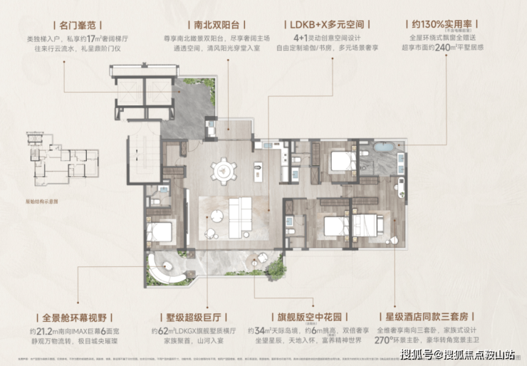 约33平方米“LDKG”横厅(将客厅、餐厅、厨房和阳台这四个公共区域融合在一起的住宅户型设计)面宽达17.6米,搭配6米挑高空中浮岛花园。