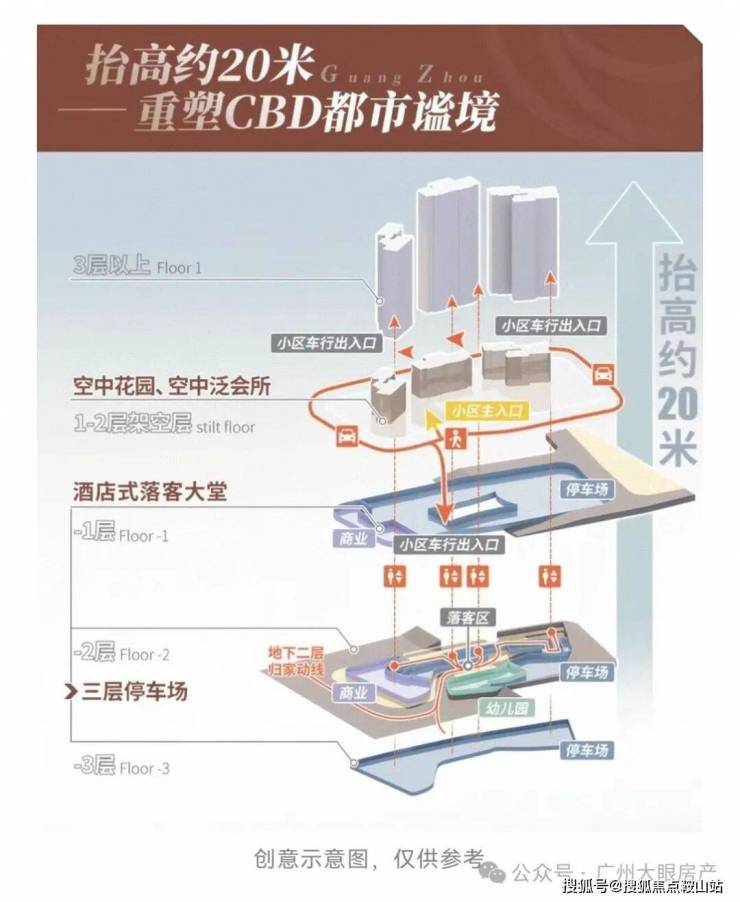 利用地形上的高差,形成了三层归家动线,这在珠江新城的豪宅当中,应该是首创了,较好的进行人车分流。