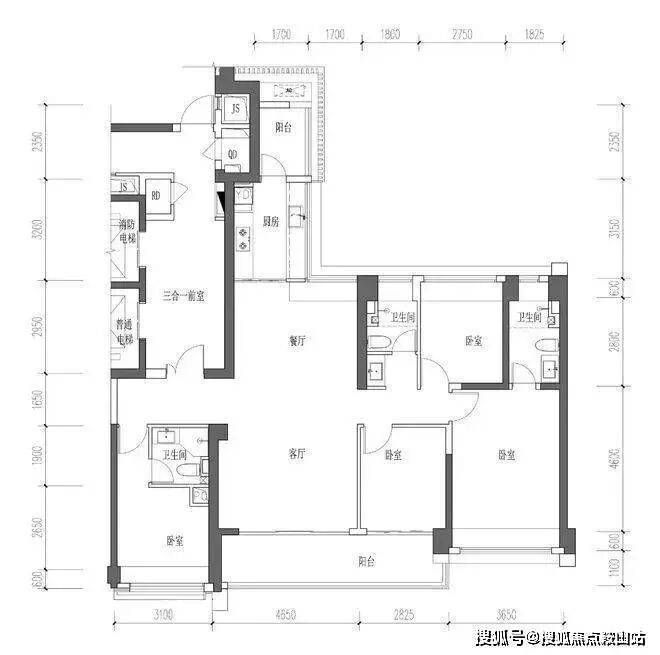 169㎡户型:4房2厅3卫,竖厅格局,2梯2户,专梯入户,得房率约68.58%(不含赠送),正南朝向。