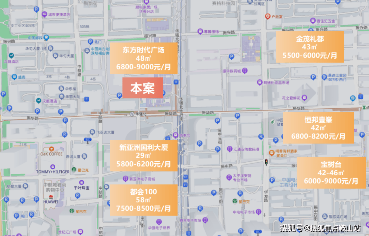 项目周边商办产品主流租金水平可达150-200元/㎡/月,一房可租6000-9000元/月,华强北有着高质量、庞大的租赁客群,稳定的租金,核芯地段优质物业注定倍受市场资金热捧(数据来源:贝壳)。