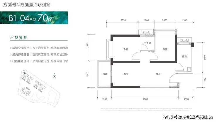 70㎡的2房2厅1卫:仅1栋B1座04户型,设计的是竖厅格局,客厅3米开间,餐客厅一体化设计,2个卧室分别做到了2.95米/2.35米的宽度,L型厨房,卫生间干湿分离,得房率:75.66%(不含赠送),阳台朝西北向。