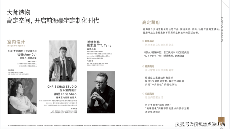 推出2栋、3栋约108套约139-176-194㎡四房以上户型,预计2027年底精装交付。这是前海首个支持定制化的住宅产品,风格/格局/功能都可以定制。