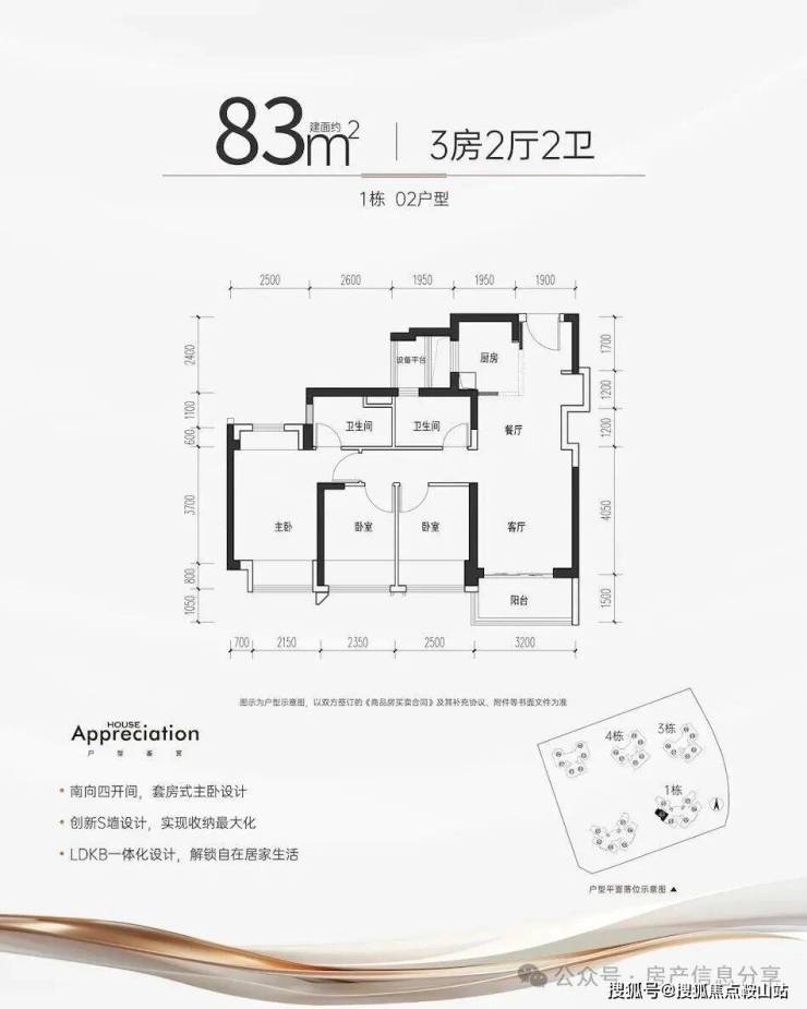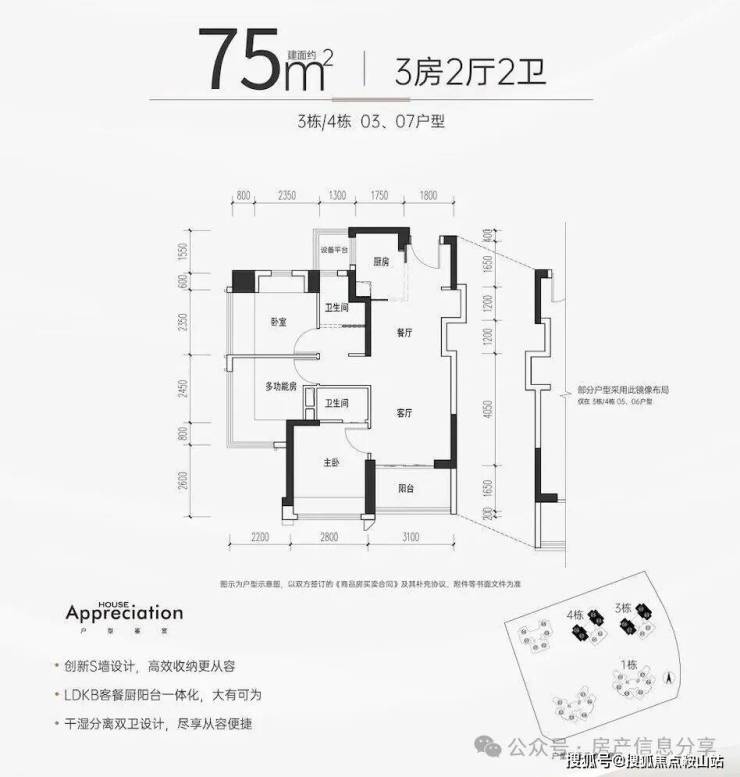 户型包括75-80-83-85㎡的三房两卫,105㎡的四房两厅两卫,使用率高达97%-104%。