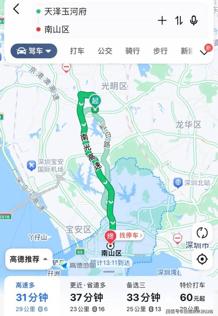 <交通>:另外通过楼下的松白路,一路往南直下,从项目上南光高速,到南山区仅29公里,约30分钟就可以直达南山西丽,留仙洞总部基地,高新园等地方。