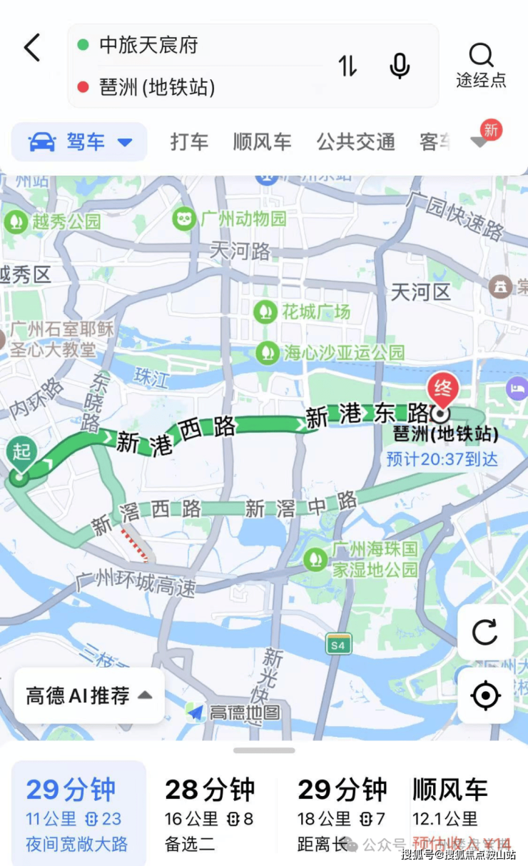 自驾或地铁通勤琶洲:走新港西路转新港东路即可到达琶洲,全程11公里耗时29分钟,打车22块,地铁9站耗时27分钟。