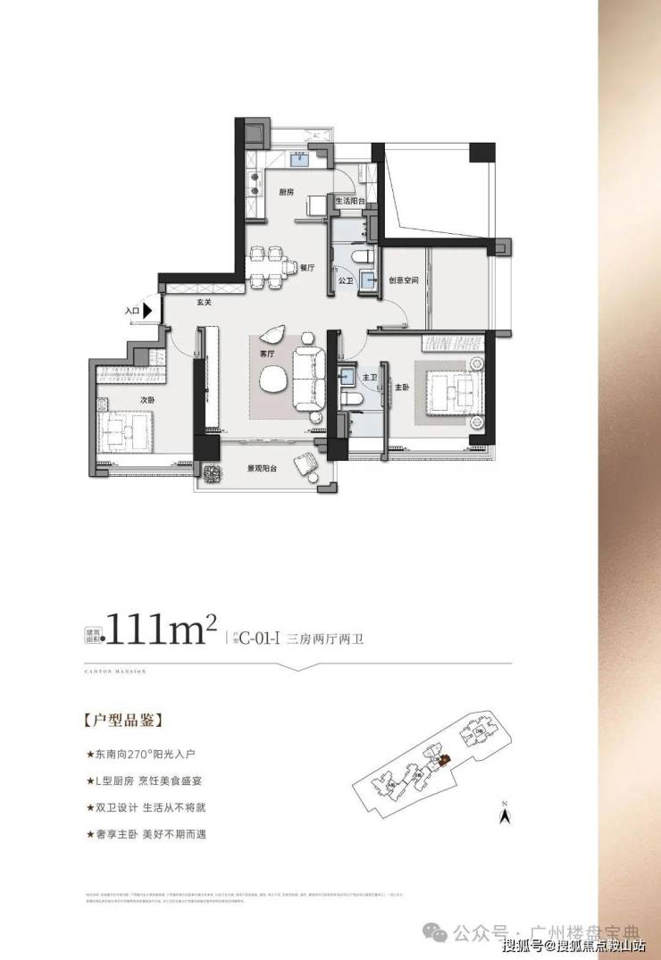 建面111平三房,南北对流改善一步到位,东南向270°阳光入户,约4.2米景观阳台,约3.5米主卧开间。