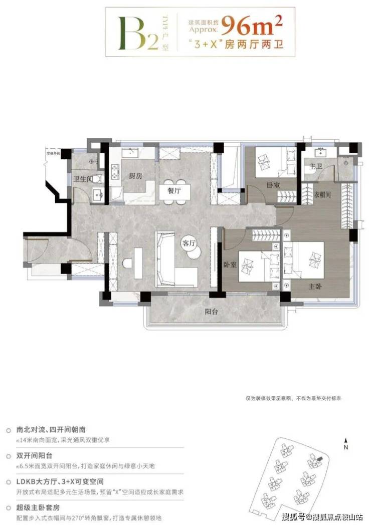 96平3+1房2卫,一个东南向南北对流版本,一个传统竖厅版本,前者更出彩。