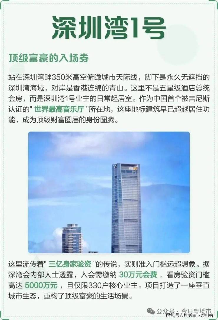 深圳湾1号以350米高度重塑城市天际线,坐拥永久无遮挡海景,对望香港青山。作为中国首个吉尼斯认证"世界最高音乐厅"所在地,其价值早已超越居住属性,成为顶级财富圈层的身份象征。
