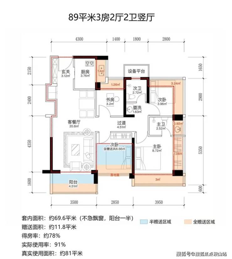 设计的是经典竖厅格局,进门入户玄关,客厅3.5米开间,动静分区,三开间朝南,3个卧室分别做到了3.95米/2.85米/2.8米的宽度,主卧+1个次卧270°飘窗,U型厨房,卫生间三段式分离,得房率约91%(包含赠送),西南或东南朝向。