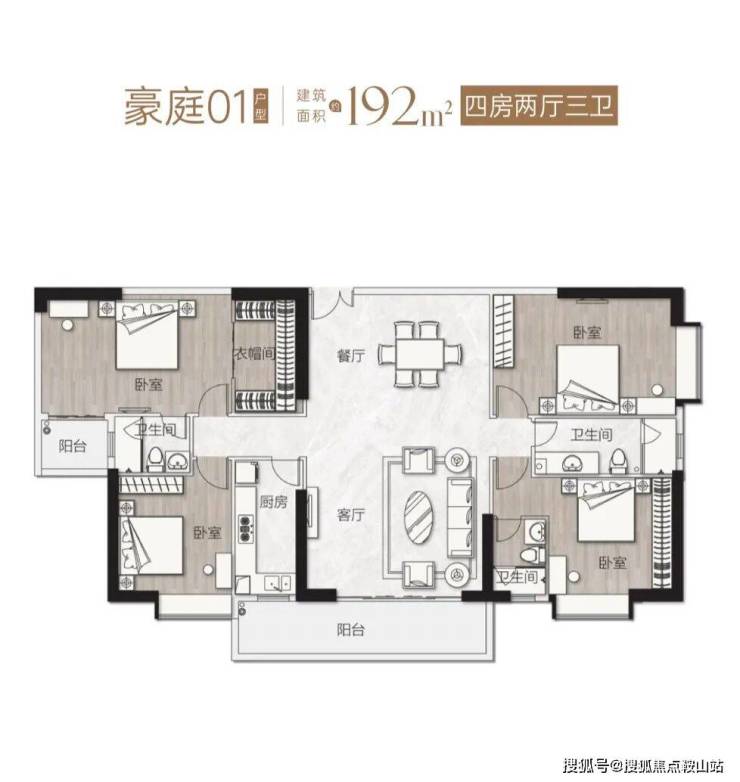 豪庭01单元——【 192㎡ 东南向 四房两厅三卫 】