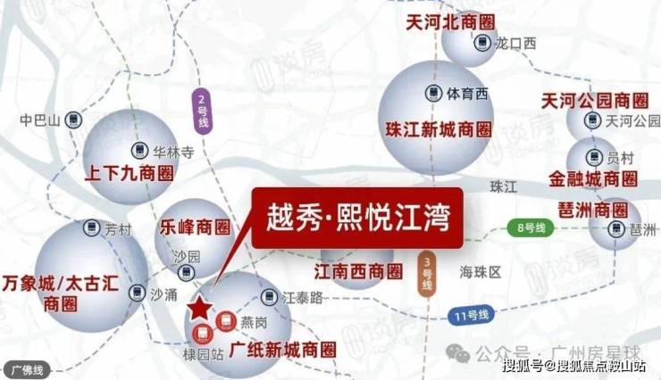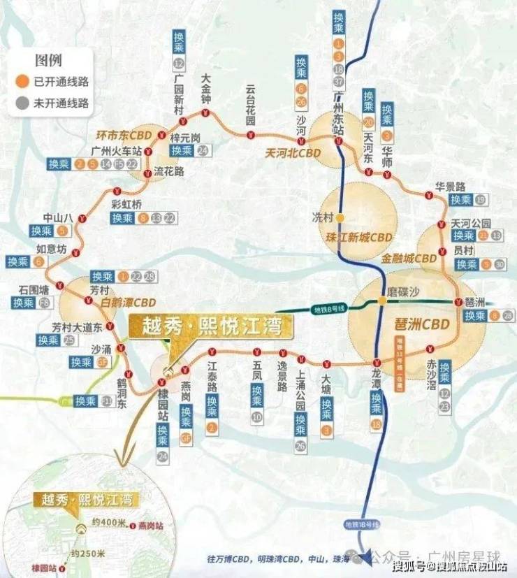 地铁:距离广佛线燕岗站B口约 400 米,广州地铁 11 号线棣园站约 250 米,7 站可达南站,7 站可达琶洲,可快速连接全城,虹吸广佛优质资源