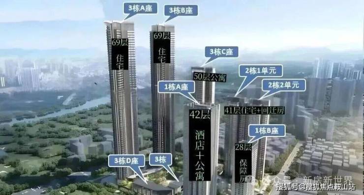 总栋数:8栋(1A栋42层酒店+公寓、1B栋28层保障房,2栋1/2单元41层住宅,3A/3B栋69层住宅;3C栋50层公寓、3D栋4层公寓)