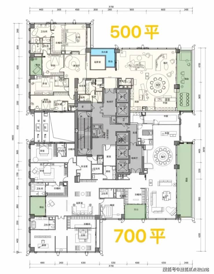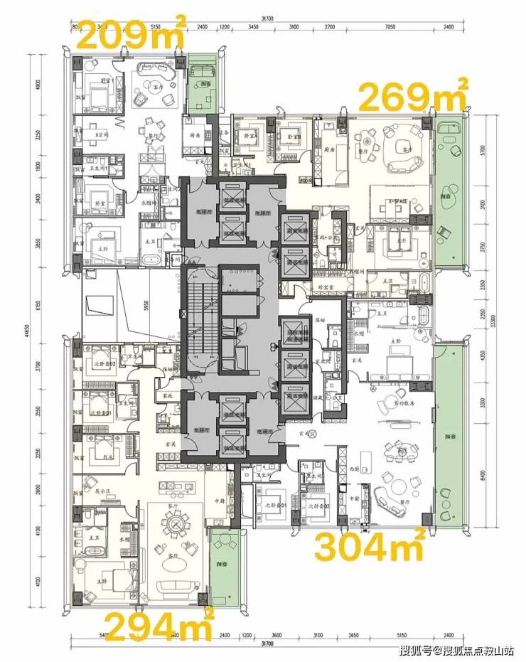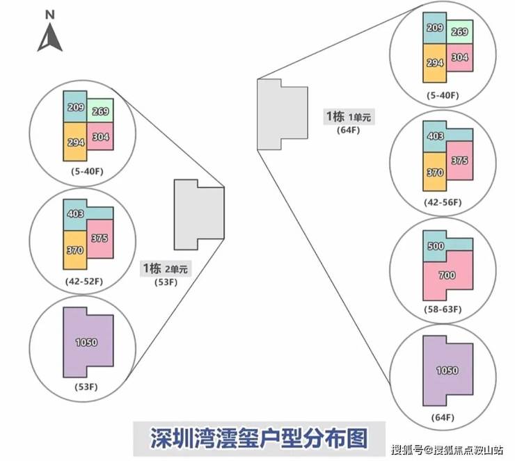 项目首推北区1-2栋共348套房源,户型覆盖209-1100㎡,全部四房三卫起步,彻底告别刚需化设计,保证了圈层的纯粹性。其中,高区58层以上为500-700㎡的顶级大平层,顶楼1100㎡的顶奢大平层仅2套,总价从3000万起,顶楼更是高达4-5亿,单价区间在14-46万/㎡,精准锁定金字塔尖客群。