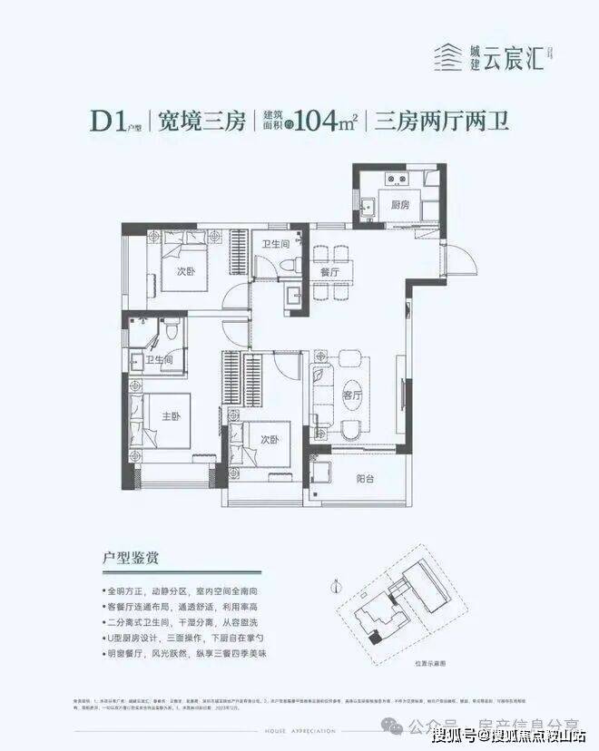 104㎡的3房2厅2卫,设计的是竖厅格局,客厅3.2米开间,LDKB一体化,动静分区,三开间朝南,U型厨房,公卫三段式分离设计,得房率:75.19%(不含赠送),客厅阳台东南朝向。