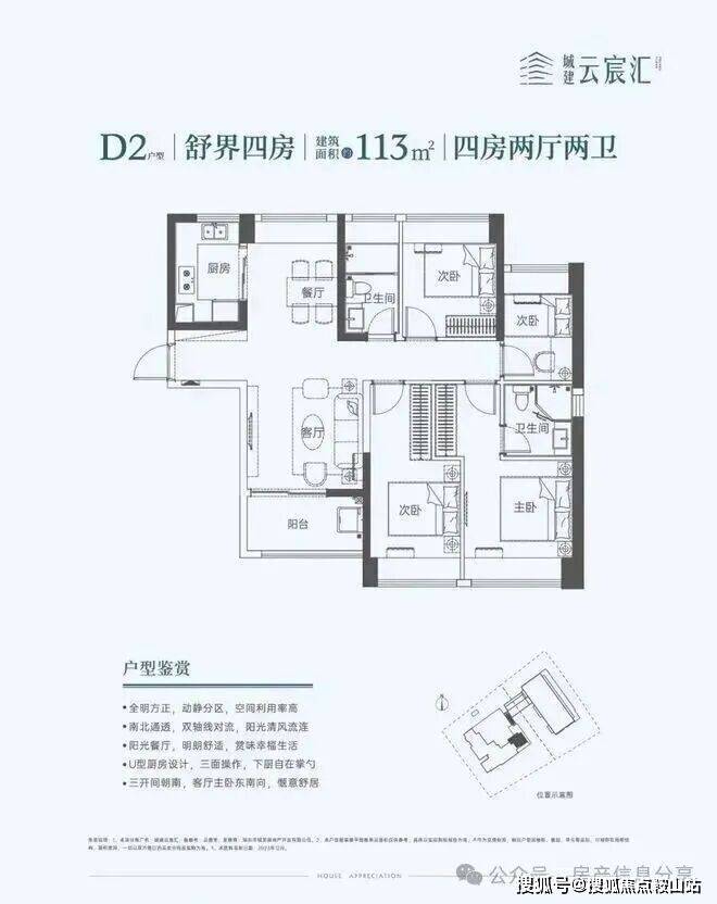 113㎡的4房2厅2卫,设计的是竖厅南北通透格局,客厅3.4米开间,LDKB一体化,三开间朝南,U型厨房,得房率:75.2%(不含赠送),客厅阳台东南朝向。