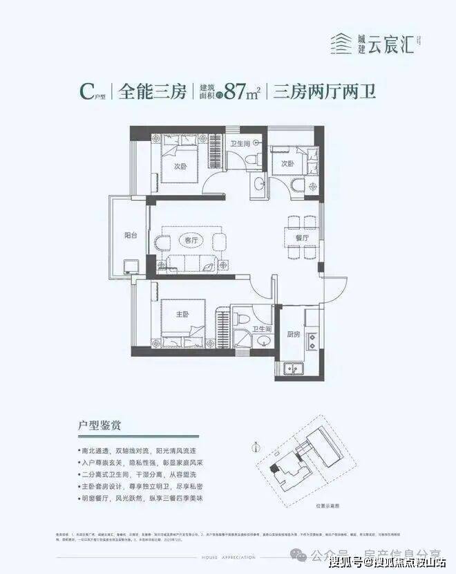 87㎡的3房2厅2卫,设计的是竖厅双龙抱珠格局,客厅3.1米开间,LDK一体化,三开间朝南,L型厨房,公卫三段式分离设计,得房率:75.2%(不含赠送),客厅阳台西南朝向。