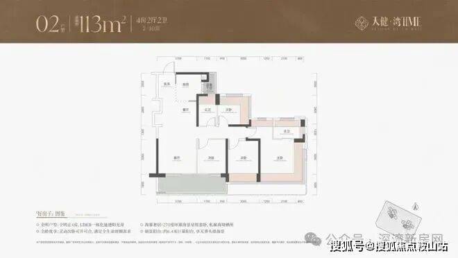 天健湾时代府/天健湾TIME,【主打低密度海景房】,在售户型和价格如下:(1)113㎡四房两卫(主力户型,南向/西南向,总价约680-860万,单价6.0-7.6万);竖厅布局,动静分区明确,主卧带270°飘窗,客厅连接阳台。4层以上可直面海景。【南向/西南向】