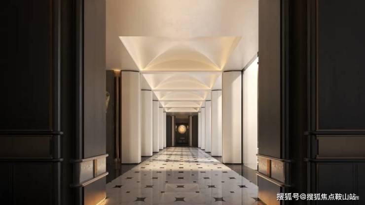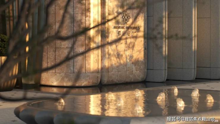 大门的水景基底,特别采用了贝壳形状设计,作为业主归家第一重礼序,约30米宽(含景墙),11米高的大门厅作为人行主出入口,彰显了恢弘尺度感与庄重感。