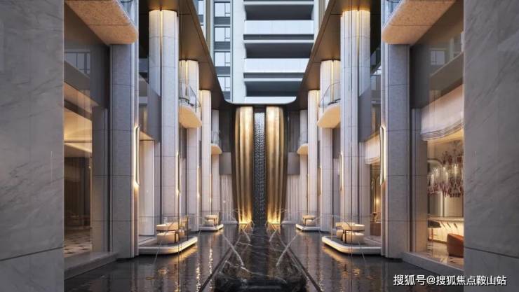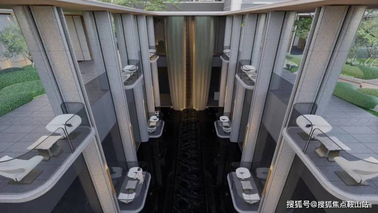 对开弯曲水柱对称式排布,是瑧誉取境于西班牙阿尔罕布拉宫的“水韵秘境”,既显阵列仪式之美,又使整个中庭更显灵动与生机。